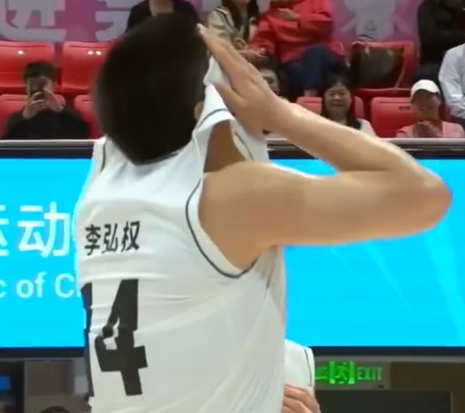 上半场结束前李弘权还有一个超远的压哨三分球,他本人都捂脸不敢相信。