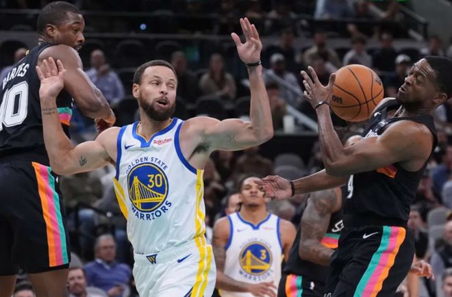 库里跳投+巴特勒三分止血,半场勇士追到49-56。进入第三节,不断在防守端被点名的库里终于爆发,突破造犯规后顶着文班亚马强投三分,随后借掩护再中三分!巴特勒三分球续上火力,库里继续造犯规+造三分犯规!中段库里撤步三分反超打停马刺,急停中距离跳投还有,跳投打板也中!节末巴特勒和霍福德内外开花,三节结束时,勇士92-84马刺。决战第四节,福克斯联合文班亚马追上比分,巴特勒和理查德下三分雨,此后双方陷入胶着。最后5分钟,库里和文班亚马对飙三分,此后库里继续造杀伤,文班亚马补篮。